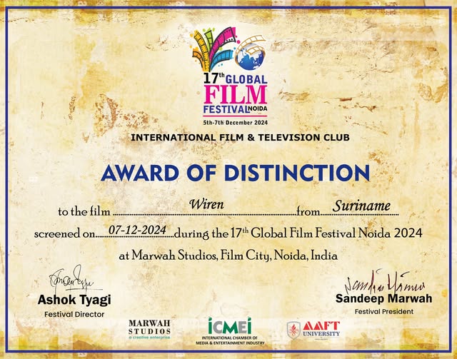 In April 2024, Wiren became the opening film at the International Film Festival of Ancient Splendor (IFFAS) in Ujjain Pradesh, India. In September 2024, Wiren was screened as the closing Film at El Cine Brasilia at the 7th Grulac Nations Film Festival in Brasilia, Brasil. The Grulac film festival is an international film festival in which films from South America, Central America and the Caribbean are selected by their own governments. In December of 2024 Wiren was selected for the prestigious 17th Global Filmfestival in Noida, India and received an Award of Distinction. In August 2025 Wiren was selected for Carifesta XV (Caribbean festival of arts) and was screened two times at the University of the West Indies (UWI) and the Golden square , Freedom Park in Barbados.